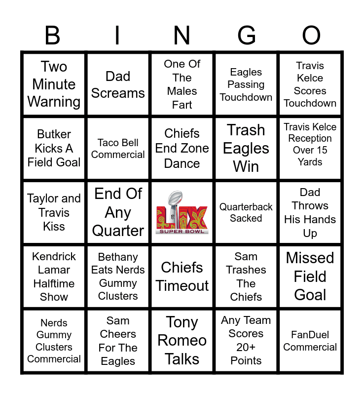 This bingo card has a free space and 49 words: Chiefs Passing Touchdown, FanDuel Commercial, Doritos Commercial, Tony Romeo Talks, Bethany Eats Nerds Gummy Clusters, Taylor Swift Shown, Dad Screams, Someone Spills Their Drink, Butker Kicks A Field Goal, Mahomes Passes To Kelce, Taco Bell Commercial, Eagles Passing Touchdown, Missed Field Goal, Sam Trashes The Chiefs, Chiefs 3 PEAT, Eagles Fumble The Ball, Chiefs End Zone Dance, Quarterback Sacked, Challenge Flag Thrown, Travis Kelce Scores Touchdown, End Of Any Quarter, Any Team Scores 20+ Points, Two Minute Warning, Trash Eagles Win, Roughing The Passer Called, Travis Kelce Reception Over 15 Yards, Nerds Gummy Clusters Commercial, Eagles Timeout, Chiefs Timeout, Kendrick Lamar Halftime Show, Inappropriate Showing On the Half Time Show, Someone Screams, Movie Trailer For Any Film, Beer Commercial, Sam Cheers For The Eagles, Football Player Cries, Poppi Soda Commercial, False Start, Dad Throws His Hands Up, Someone Falls Asleep, Bethany Leaves The Room, Someone Goes To The Bathroom, Elizabeth Eats Cookie Cake, Elizabeth Picks Out The CC In The Cookie Cake, Taylor and Travis Kiss, One Of The Males Fart, Someone Goes On Their Phone, Someone Says Eat Dirt and Sam Eats His Garlic Dill Dip.