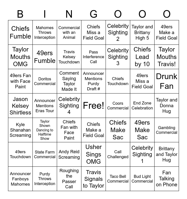 This bingo card has a free space and 48 words: Call Challenged, Chiefs Lead by 10, Travis Signals to Taylor, Announcer Mentions Eras Tour, Comment Saying Taylor Made It, Taylor and Donna Hug, Mahomes Throws Interception, Purdy Throws Interception, Taylor and Brittany High 5, Chiefs Make a Field Goal, 49ers Make a Field Goal, Chiefs Miss a Field Goal, 49ers Miss a Field Goal, Chiefs Touchdown, 49ers Touchdown, End Zone Celebration, Taylor Mouths OMG, Taylor Mouths Travis!, Celebrity Sighting 1, Celebrity Sighting 2, Celebrity Sighting 3, Celebrity Sighting 4, Chiefs Fumble, 49ers Fumble, Brittany and Taylor Hug, Travis Kelsey Touchdown, Drunk Fan, Announcer Fanboys Mahomes, Announcer Mentions Purdy Draft #, Doritos Commercial, Bud Light Commercial, Coors Commercial, Gambling Commercial, State Farm Commercial, Jason Kelsey Shirtless, Chiefs Make Sac, 49ers Make Sac, 49ers Fan with Face Paint, Chiefs Fan with Face Paint, Andy Reid Screaming, Kyle Shanahan Screaming, Fan Talking on Phone, Commercial with an Animal, Roughing the Passer Call, Pass Interference Call, Usher Sings OMG, Taylor Shown Dancing to Halftime Show and Taco Bell Commercial.