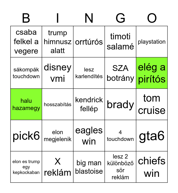 This bingo card has a free space and 24 words: elon megjelenik, X reklám, lesz karlendítés, elon es trump egy kepkockaban, playstation, csaba felkel a vegere, sákompák touchdown, trump himnusz alatt, brady, eagles win, SZA botrány, halu hazamegy, 4 touchdown, gta6, disney vmi, lesz 2 különböző sör reklám, tom cruise, orrtúrós, elég a pirítós, hosszabítás, chiefs win, pick6, timoti salamé and big man blastoise.