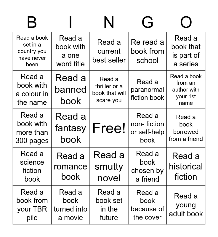 This bingo card has a free space and 24 words: Read a book from your TBR pile, Read a romance book, Read a thriller or a book that will scare you, Read a book because of the cover, Read a book that is part of a series, Read a book set in a country you have never been, Read a book with a one word title, Read a current best seller, Read a non- fiction or self-help book, Read a book borrowed from a friend, Read a book with more than 300 pages, Read a banned book, Read a book chosen by a friend, Read a historical fiction, Read a book with a colour in the name, Read a book turned into a movie, Read a book set in the future, Re read a book from school, Read a book from an author with your 1st name, Read a science fiction book, Read a fantasy book, Read a smutty novel, Read a paranormal fiction book and Read a young adult book.
