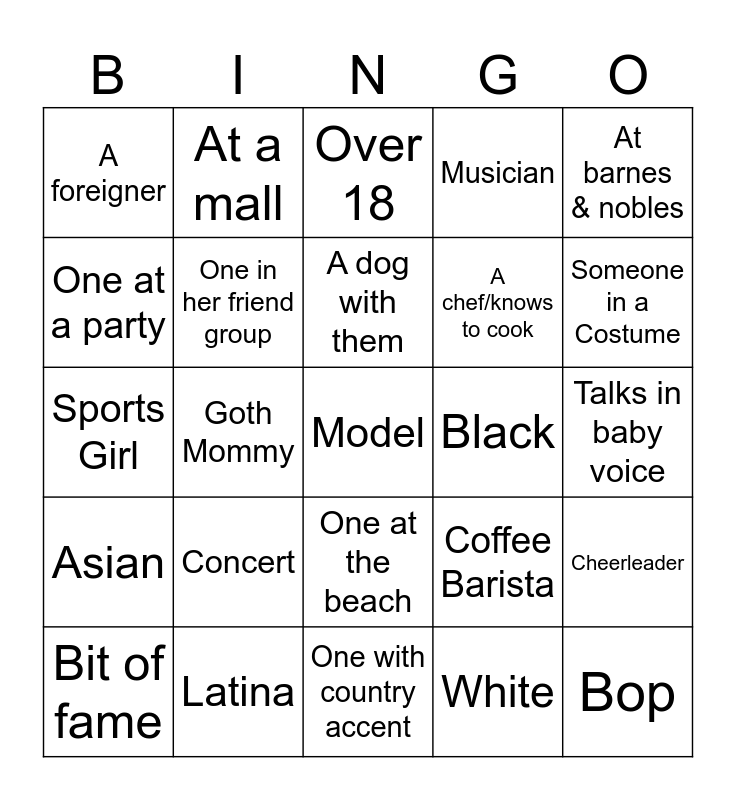 This bingo card has 25 words: Asian, Latina, Model, White, At barnes & nobles, A foreigner, At a mall, Over 18, Black, Cheerleader, One at a party, One in her friend group, One with country accent, Coffee Barista, Someone in a Costume, Bit of fame, Goth Mommy, A dog with them, A chef/knows to cook, Talks in baby voice, Sports Girl, Concert, One at the beach, Musician and Bop.