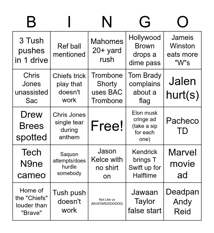 This bingo card has a free space and 25 words: Saquon attempts/does hurdle somebody, Not Like us (MUSTARDDDDDDD), Trombone Shorty uses BAC Trombone, Home of the "Chiefs" louder than "Brave", Jameis Winston eats more "W"s, 3 Tush pushes in 1 drive, Chris Jones unassisted Sac, Ref ball mentioned, Elon musk cringe ad (take a sip for each one), Jason Kelce with no shirt on, Tom Brady complains about a flag, Drew Brees spotted, Kendrick brings T Swift up for Halftime, Marvel movie ad, Chiefs trick play that doesn't work, Free, Pacheco TD, Mahomes 20+ yard rush, Jalen hurt(s), Chris Jones single tear during anthem, Deadpan Andy Reid, Tush push doesn't work, Tech N9ne cameo, Hollywood Brown drops a dime pass and Jawaan Taylor false start.