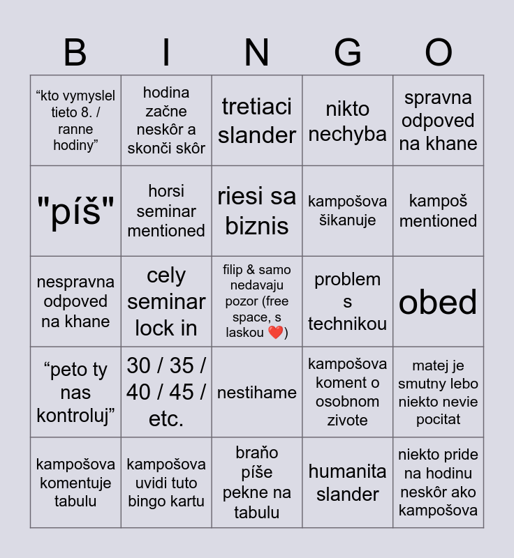 This bingo card has a free space and 34 words: prémie, humanita slander, niekto chyba a m si sadne na ich miesto, >10 minut na 1 priklad, “peto ty nas kontroluj”, horsi seminar mentioned, spravna odpoved na khane, kampošova komentuje tabulu, hodina začne neskôr a skonči skôr, CNC, riesi sa biznis, tretiaci slander, sadloň jumpscare, peter brainrot referencia, problem s technikou, kampoš mentioned, kampošova uvidi tuto bingo kartu, nespravna odpoved na khane, 30 / 35 / 40 / 45 / etc., kampošova koment o osobnom zivote, nestihame, AP mentioned, “kto vymyslel tieto 8. / ranne hodiny”, obed, braňo píše pekne na tabulu, niekto pride na hodinu neskôr ako kampošova, nikto nechyba, dano nechyba, kampošova šikanuje, "píš", cely seminar sa smeje, cely seminar lock in, matej je smutny lebo niekto nevie pocitat and "rata sa to?" debata ohladom binga.