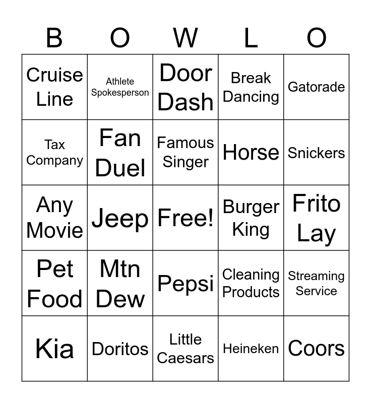 This bingo card has a free space and 29 words: Kia, Budwiser, Jeep, Cell Phone Carrier, Cruise Line, Door Dash, Fan Duel, Mtn Dew, Burger King, Doritos, Frito Lay, Coors, Little Caesars, Heineken, Snickers, McDonalds, Pepsi, Pet Food, Gatorade, Any Movie, Cleaning Products, Talking Animal Commercial, Horse, Tax Company, Break Dancing, Athlete Spokesperson, Streaming Service, Famous Singer and Famous Actor.