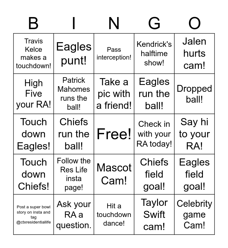 This bingo card has a free space and 24 words: Follow the Res Life insta page!, Ask your RA a question., Take a pic with a friend!, Post a super bowl story on insta and tag @ctxresidentiallife, Jalen hurts cam!, Travis Kelce makes a touchdown!, High Five your RA!, Eagles punt!, Check in with your RA today!, Mascot Cam!, Eagles run the ball!, Touch down Eagles!, Chiefs field goal!, Eagles field goal!, Patrick Mahomes runs the ball!, Taylor Swift cam!, Say hi to your RA!, Pass interception!, Dropped ball!, Chiefs run the ball!, Celebrity game Cam!, Touch down Chiefs!, Kendrick's halftime show! and Hit a touchdown dance!.