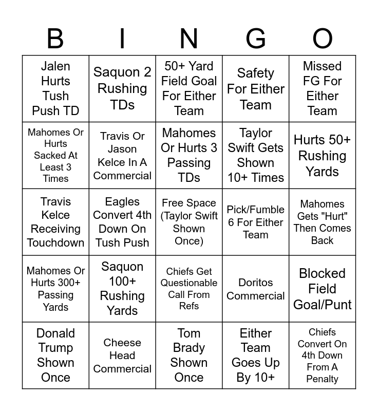 This bingo card has a free space and 24 words: Saquon 100+ Rushing Yards, Cheese Head Commercial, Mahomes Or Hurts 3 Passing TDs, Donald Trump Shown Once, Missed FG For Either Team, Jalen Hurts Tush Push TD, Mahomes Or Hurts Sacked At Least 3 Times, Saquon 2 Rushing TDs, Pick/Fumble 6 For Either Team, Chiefs Get Questionable Call From Refs, Taylor Swift Gets Shown 10+ Times, Travis Kelce Receiving Touchdown, Doritos Commercial, Blocked Field Goal/Punt, Travis Or Jason Kelce In A Commercial, Either Team Goes Up By 10+, Mahomes Gets "Hurt" Then Comes Back, 50+ Yard Field Goal For Either Team, Hurts 50+ Rushing Yards, Eagles Convert 4th Down On Tush Push, Chiefs Convert On 4th Down From A Penalty, Mahomes Or Hurts 300+ Passing Yards, Safety For Either Team and Tom Brady Shown Once.