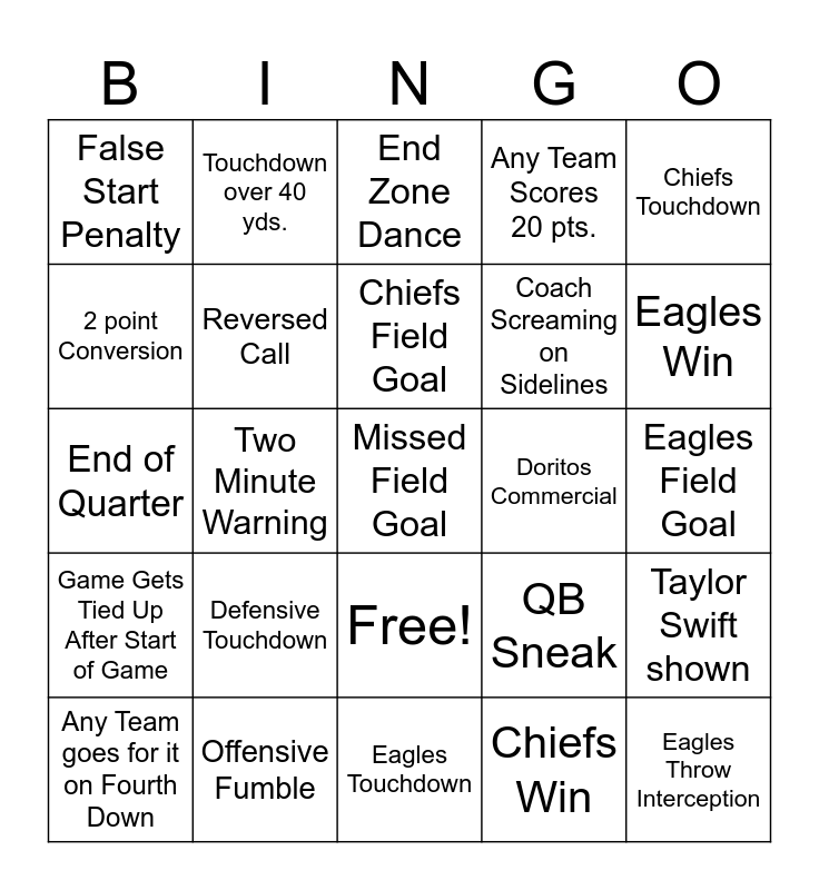 This bingo card has 26 words: Free!, Chiefs Win, Chiefs Field Goal, Offensive Fumble, Chiefs Touchdown, False Start Penalty, 2 point Conversion, Touchdown over 40 yds., Eagles Field Goal, QB Sneak, Coach Screaming on Sidelines, End of Quarter, Taylor Swift shown, Any Team goes for it on Fourth Down, Two Minute Warning, Chiefs Throw an Interception, Any Team Scores 20 pts., Game Gets Tied Up After Start of Game, End Zone Dance, Missed Field Goal, Eagles Win, Eagles Touchdown, Doritos Commercial, Defensive Touchdown, Reversed Call and Eagles Throw Interception.