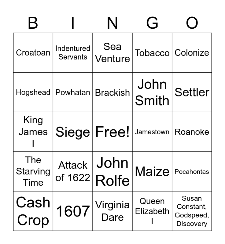 This bingo card has a free space and 24 words: Attack of 1622, 1607, Brackish, Cash Crop, Colonize, Croatoan, Hogshead, Indentured Servants, Jamestown, John Rolfe, John Smith, King James I, Maize, Pocahontas, Powhatan, Queen Elizabeth I, Roanoke, Sea Venture, Settler, Siege, Susan Constant, Godspeed, Discovery, The Starving Time, Tobacco and Virginia Dare.