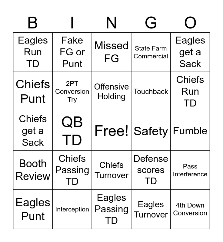 This bingo card has a free space and 29 words: Eagles Punt, Defensive Offsides, QB TD, Peyton Wins KOD3, Eagles Run TD, Missed FG, 2PT Conversion Try, Chiefs Passing TD, Safety, Interception, Fumble, 4th Down Conversion, Eagles Passing TD, Eagles Turnover, Chiefs Run TD, Eli Wins KOD3, Chiefs Turnover, Booth Review, Eagles get a Sack, Chiefs get a Sack, Defense scores TD, Offensive False Start, Touchback, Chiefs Punt, State Farm Commercial, Fake FG or Punt, Pass Interference, Offensive Holding and Delay of Game.