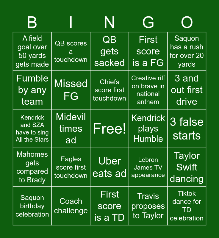 This bingo card has a free space and 24 words: Saquon birthday celebration, Eagles score first touchdown, Chiefs score first touchdown, Travis proposes to Taylor, Saquon has a rush for over 20 yards, A field goal over 50 yards gets made, QB scores a touchdown, QB gets sacked, Kendrick plays Humble, 3 false starts, Kendrick and SZA have to sing All the Stars, Missed FG, Lebron James TV appearance, Taylor Swift dancing, Fumble by any team, Coach challenge, First score is a TD, First score is a FG, 3 and out first drive, Mahomes gets compared to Brady, Midevil times ad, Uber eats ad, Creative riff on brave in national anthem and Tiktok dance for TD celebration.