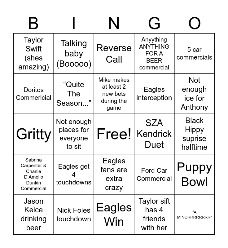 This bingo card has a free space and 24 words: Eagles get 4 touchdowns, Nick Foles touchdown, Mike makes at least 2 new bets during the game, Jason Kelce drinking beer, 5 car commercials, Taylor Swift (shes amazing), Doritos Commericial, Talking baby (Booooo), SZA Kendrick Duet, Eagles fans are extra crazy, Eagles interception, Gritty, Ford Car Commercial, Puppy Bowl, “Quite The Season...”, Taylor sift has 4 friends with her, Black Hippy suprise halftime, Reverse Call, Not enough ice for Anthony, Not enough places for everyone to sit, “A MINORRRRRRRR”, Sabrina Carpenter & Charlie D’Amelio Dunkin Commercial, Anyything ANYTHING FOR A BEER commercial and Eagles Win.