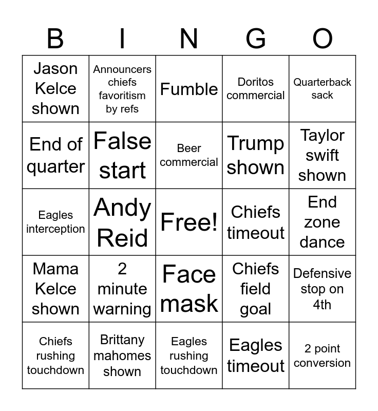 This bingo card has a free space and 24 words: 2 minute warning, Brittany mahomes shown, Beer commercial, Chiefs rushing touchdown, Quarterback sack, Jason Kelce shown, End of quarter, Announcers chiefs favoritism by refs, Chiefs timeout, Face mask, Trump shown, Eagles interception, Chiefs field goal, Defensive stop on 4th, False start, Eagles timeout, End zone dance, Fumble, Taylor swift shown, Andy Reid, 2 point conversion, Mama Kelce shown, Doritos commercial and Eagles rushing touchdown.