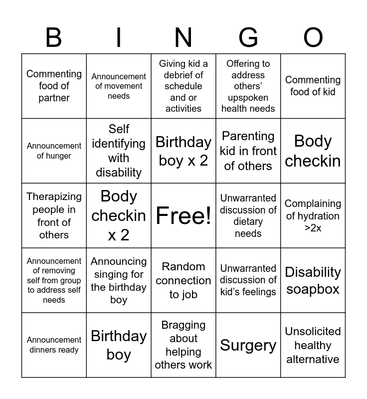 This bingo card has a free space and 24 words: Announcing singing for the birthday boy, Birthday boy, Birthday boy x 2, Announcement dinners ready, Commenting food of kid, Commenting food of partner, Announcement of hunger, Announcement of movement needs, Unwarranted discussion of dietary needs, Random connection to job, Parenting kid in front of others, Therapizing people in front of others, Unwarranted discussion of kid’s feelings, Disability soapbox, Self identifying with disability, Surgery, Complaining of hydration >2x, Giving kid a debrief of schedule and or activities, Body checkin, Body checkin x 2, Unsolicited healthy alternative, Announcement of removing self from group to address self needs, Offering to address others’ upspoken health needs and Bragging about helping others work.