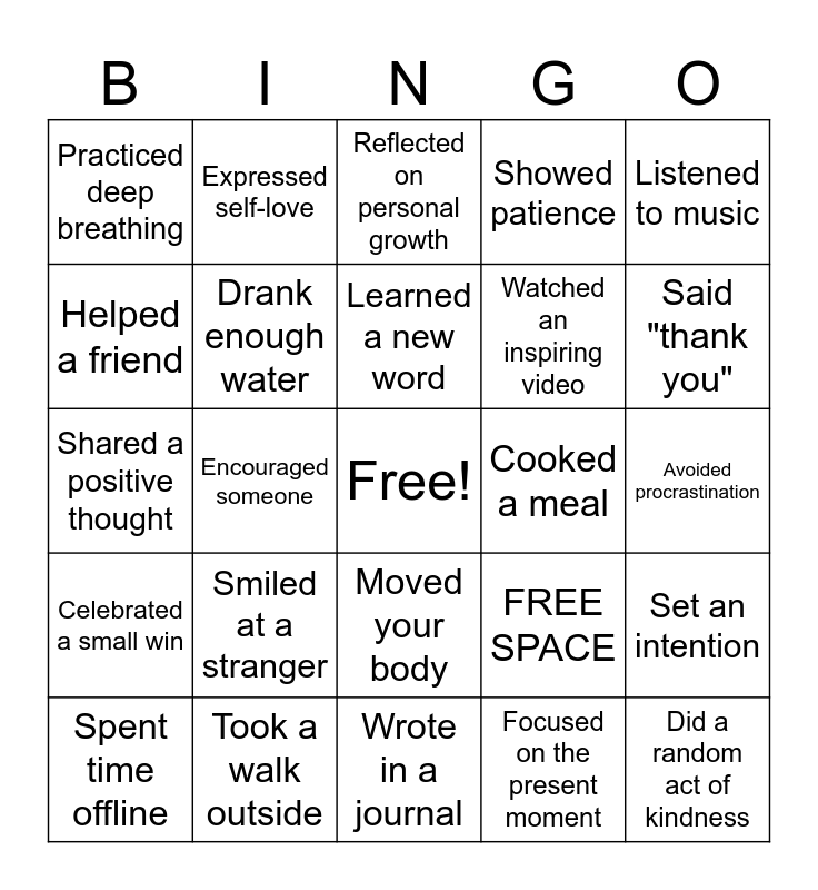 This bingo card has a free space and 25 words: Smiled at a stranger, Wrote in a journal, Learned a new word, Spent time offline, Listened to music, Practiced deep breathing, Helped a friend, Expressed self-love, Cooked a meal, Moved your body, Watched an inspiring video, Shared a positive thought, FREE SPACE, Set an intention, Drank enough water, Completed a task, Avoided procrastination, Reflected on personal growth, Said "thank you", Encouraged someone, Did a random act of kindness, Took a walk outside, Celebrated a small win, Showed patience and Focused on the present moment.
