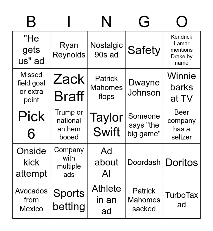 This bingo card has a free space and 35 words: Donald Trump, Elon Musk, Crypto ad, Zack Braff, Ad about AI, Safety, Missed field goal or extra point, Successful 2 point try, Patrick Mahomes flops, Controversial ref call, Pick 6, Kendrick Lamar mentions Drake by name, Clydesdales, AI generated ad, "He gets us" ad, Someone says "the big game", Patrick Mahomes sacked, Trump or national anthem booed, Onside kick attempt, TurboTax ad, Doordash, Avocados from Mexico, Doritos, Sports betting, Nostalgic 90s ad, Winnie barks at TV, Snoop Dog, John Cena, Dwayne Johnson, Beer company has a seltzer, Coca-Cola polar bears, Athlete in an ad, Company with multiple ads, Ryan Reynolds and Old celebrity cameo.