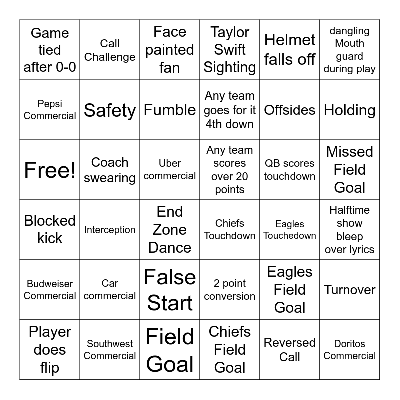 This bingo card has 36 words: 2 point conversion, False Start, Chiefs Field Goal, Pepsi Commercial, Blocked kick, Any team scores over 20 points, Safety, Field Goal, Helmet falls off, Eagles Field Goal, Holding, Taylor Swift Sighting, Turnover, Coach swearing, Any team goes for it 4th down, Game tied after 0-0, Budweiser Commercial, QB scores touchdown, Free!, Face painted fan, Uber commercial, Interception, Chiefs Touchdown, End Zone Dance, Eagles Touchedown, Call Challenge, Offsides, Southwest Commercial, Fumble, dangling Mouth guard during play, Doritos Commercial, Player does flip, Halftime show bleep over lyrics, Missed Field Goal, Car commercial and Reversed Call.