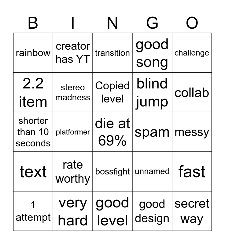 This bingo card has a free space and 24 words: rate worthy, very hard, Copied level, 1 attempt, challenge, rainbow, 2.2 item, creator has YT, spam, bossfight, blind jump, shorter than 10 seconds, unnamed, fast, stereo madness, good design, messy, transition, collab, platformer, secret way, text, good song and good level.