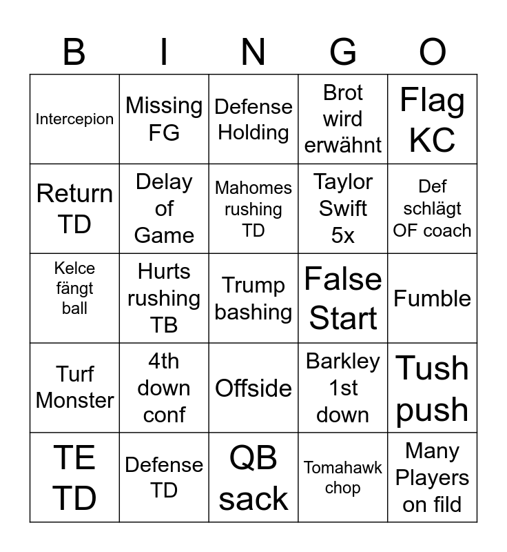 This bingo card has a free space and 24 words: TE TD, 4th down conf, Mahomes rushing TD, Tomahawk chop, Flag KC, Intercepion, Missing FG, Defense Holding, False Start, Fumble, Kelce fängt ball, Delay of Game, Barkley 1st down, Tush push, Return TD, Defense TD, QB sack, Brot wird erwähnt, Def schlägt OF coach, Turf Monster, Hurts rushing TB, Offside, Taylor Swift 5x and Many Players on fild.