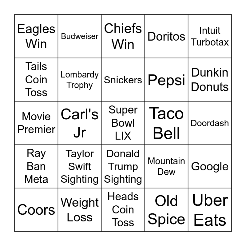 This bingo card has a free space and 24 words: Taylor Swift Sighting, Weight Loss, Snickers, Coors, Intuit Turbotax, Eagles Win, Tails Coin Toss, Budweiser, Taco Bell, Donald Trump Sighting, Pepsi, Movie Premier, Mountain Dew, Google, Lombardy Trophy, Old Spice, Doordash, Chiefs Win, Dunkin Donuts, Carl's Jr, Uber Eats, Ray Ban Meta, Doritos and Heads Coin Toss.