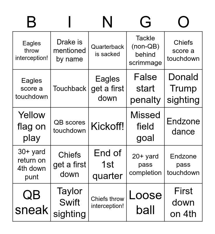 This bingo card has a free space and 24 words: Chiefs get a first down, Taylor Swift sighting, Eagles get a first down, QB sneak, Chiefs score a touchdown, Eagles throw interception!, Eagles score a touchdown, Drake is mentioned by name, Missed field goal, End of 1st quarter, False start penalty, Yellow flag on play, 20+ yard pass completion, Endzone pass touchdown, Touchback, Loose ball, Endzone dance, Quarterback is sacked, Donald Trump sighting, QB scores touchdown, First down on 4th, 30+ yard return on 4th down punt, Tackle (non-QB) behind scrimmage and Chiefs throw interception!.