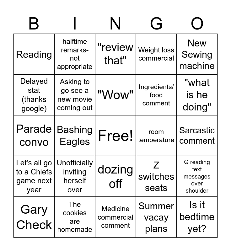 This bingo card has a free space and 24 words: Unofficially inviting herself over, The cookies are homemade, "Wow", Gary Check, New Sewing machine, Reading, Delayed stat (thanks google), halftime remarks- not appropriate, room temperature, dozing off, Ingredients/ food comment, Parade convo, Z switches seats, G reading text messages over shoulder, Asking to go see a new movie coming out, Summer vacay plans, Sarcastic comment, "review that", "what is he doing", Bashing Eagles, Is it bedtime yet?, Let's all go to a Chiefs game next year, Weight loss commercial and Medicine commercial comment.
