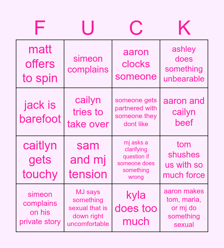 This bingo card has 16 words: MJ says something sexual that is down right uncomfortable, tom shushes us with so much force, aaron clocks someone, matt offers to spin, caitlyn gets touchy, simeon complains, mj asks a clarifying question if someone does something wrong, kyla does too much, jack is barefoot, cailyn tries to take over, simeon complains on his private story, ashley does something unbearable, sam and mj tension, aaron and cailyn beef, someone gets partnered with someone they dont like and aaron makes tom, maria, or mj do something sexual.