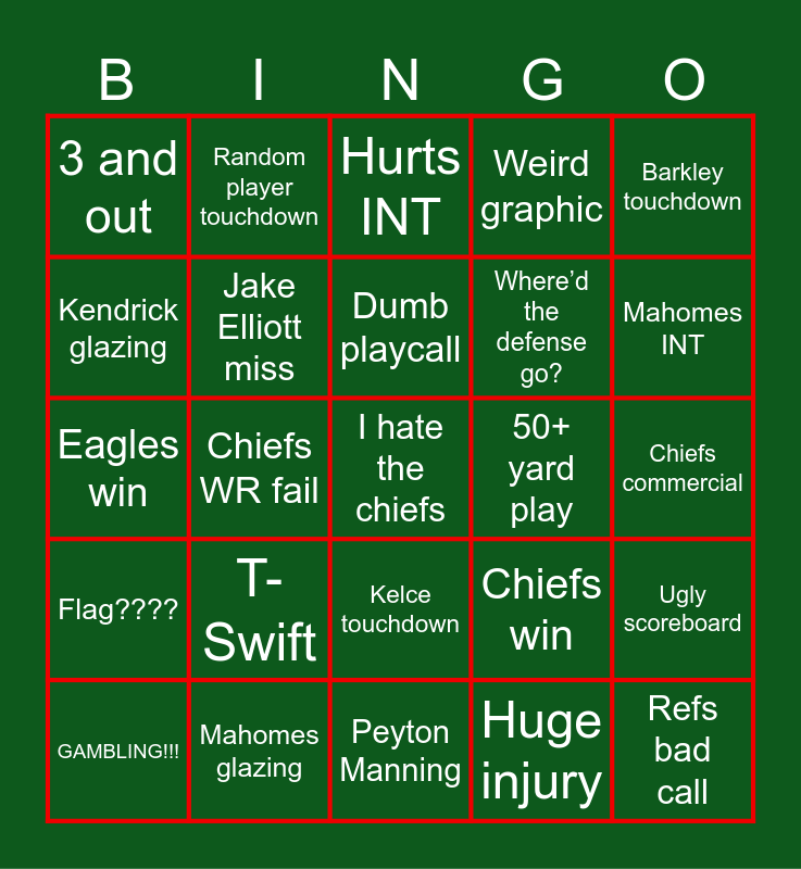 This bingo card has a free space and 24 words: T-Swift, Mahomes glazing, Dumb playcall, GAMBLING!!!, Barkley touchdown, 3 and out, Kendrick glazing, Random player touchdown, 50+ yard play, Kelce touchdown, Where’d the defense go?, Eagles win, Chiefs win, Ugly scoreboard, Jake Elliott miss, Huge injury, Chiefs commercial, Hurts INT, Mahomes INT, Chiefs WR fail, Refs bad call, Flag????, Weird graphic and Peyton Manning.