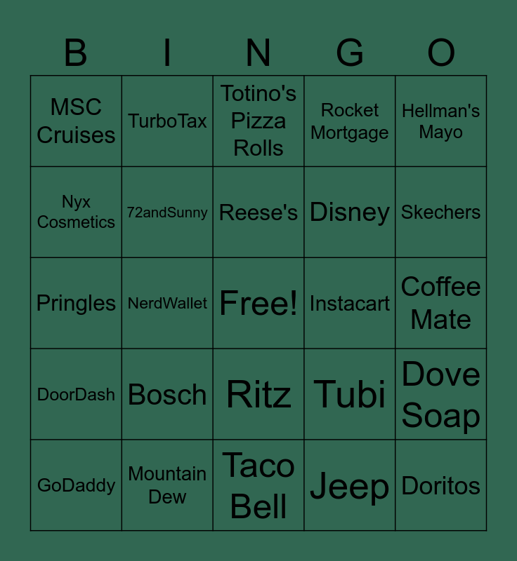 This bingo card has a free space and 24 words: GoDaddy, Bosch, Reese's, Jeep, Hellman's Mayo, MSC Cruises, TurboTax, Totino's Pizza Rolls, Instacart, Coffee Mate, Pringles, 72andSunny, Tubi, Dove Soap, Nyx Cosmetics, Mountain Dew, Taco Bell, Rocket Mortgage, Skechers, DoorDash, NerdWallet, Ritz, Disney and Doritos.