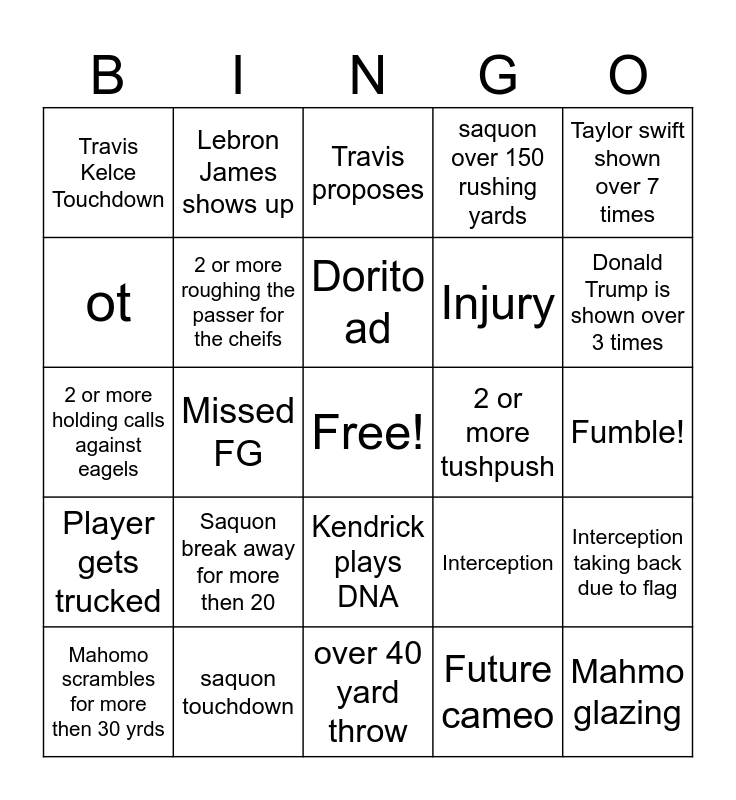 This bingo card has a free space and 24 words: Mahomo scrambles for more then 30 yrds, Saquon break away for more then 20, Dorito ad, Future cameo, Taylor swift shown over 7 times, Travis Kelce Touchdown, Lebron James shows up, Travis proposes, 2 or more tushpush, Fumble!, 2 or more holding calls against eagels, 2 or more roughing the passer for the cheifs, Interception, Interception taking back due to flag, ot, saquon touchdown, over 40 yard throw, saquon over 150 rushing yards, Donald Trump is shown over 3 times, Player gets trucked, Missed FG, Kendrick plays DNA, Injury and Mahmo glazing.