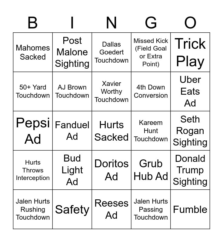 This bingo card has 62 words: Saquon Barkley Touchdown, Safety, Mahomes Throws Interception, Hurts Throws Interception, Fumble, Tush Push, AJ Brown Touchdown, Devonta Smith Touchdown, 4th Down Conversion, Turnover On Downs, Missed Kick (Field Goal or Extra Point), Travis Kelce Touchdown, 50+ Yard Touchdown, Eagles Field Goal, Chiefs Field Goal, Mahomes Sacked, Hurts Sacked, Trick Play, Taylor Swift Sighting, Xavier Worthy Touchdown, Kareem Hunt Touchdown, Dallas Goedert Touchdown, Jalen Hurts Rushing Touchdown, Jalen Hurts Passing Touchdown, Patrick Mahomes Rushing Touchdown, Patrick Mahomes Passing Touchdown, Taylor Swift Sighting, Paul Rudd Sighting, Donald Trump Sighting, Jason Kelce Sighting, Mathew Mcconaughey Sighting, Tim Robinson Sighting, Pete Davidson Sighting, Kevin Hart Sighting, Seth Rogan Sighting, Post Malone Sighting, Bradley Cooper Sighting, Kanye Sighting, Fanduel Ad, Mountan Dew Ad, Pepsi Ad, Turbo Tax Ad, Bud Light Ad, Google Pixel Ad, Uber Eats Ad, Grub Hub Ad, Doordash Ad, Pringles Ad, Go Daddy Ad, Budweiser Ad, Doritos Ad, Reeses Ad, Taco Bell Ad, Coors Light Ad, Apple TV Ad, Disney Plus Ad, "Not Like Us" Performed, "All the Stars" Performed, "Humble" Performed, "King Kunta" Performed, "DNA" Performed and Halftime Show Guest Apperance.