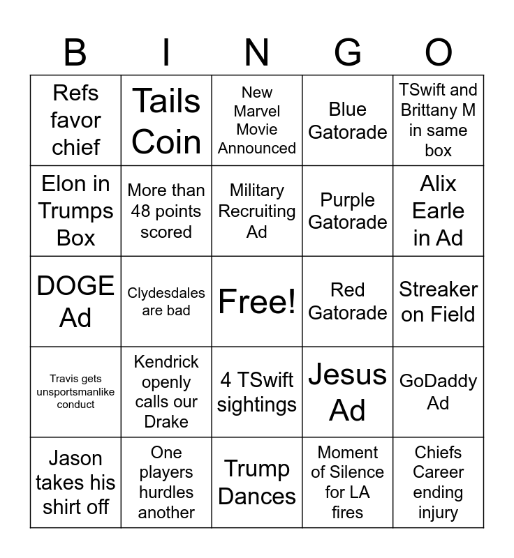 This bingo card has a free space and 24 words: Kendrick openly calls our Drake, One players hurdles another, Military Recruiting Ad, Jason takes his shirt off, TSwift and Brittany M in same box, Refs favor chief, Elon in Trumps Box, Tails Coin, Red Gatorade, 4 TSwift sightings, Purple Gatorade, DOGE Ad, Jesus Ad, GoDaddy Ad, More than 48 points scored, Moment of Silence for LA fires, Streaker on Field, New Marvel Movie Announced, Alix Earle in Ad, Clydesdales are bad, Chiefs Career ending injury, Travis gets unsportsmanlike conduct, Blue Gatorade and Trump Dances.