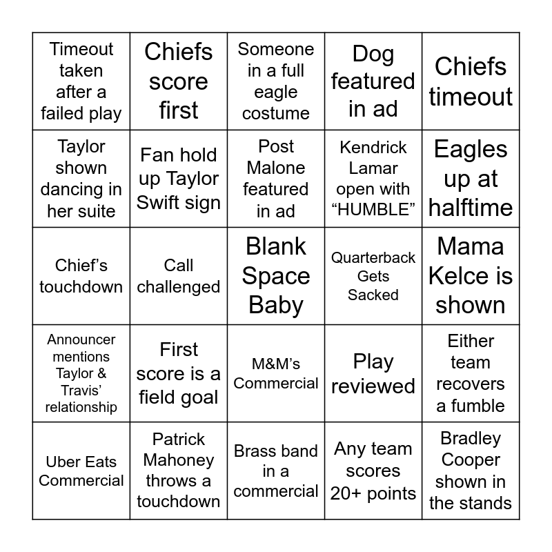 This bingo card has a free space and 24 words: First score is a field goal, Patrick Mahoney throws a touchdown, Post Malone featured in ad, Uber Eats Commercial, Chiefs timeout, Timeout taken after a failed play, Taylor shown dancing in her suite, Chiefs score first, Quarterback Gets Sacked, M&M’s Commercial, Kendrick Lamar open with “HUMBLE”, Chief’s touchdown, Play reviewed, Either team recovers a fumble, Fan hold up Taylor Swift sign, Any team scores 20+ points, Mama Kelce is shown, Someone in a full eagle costume, Eagles up at halftime, Call challenged, Bradley Cooper shown in the stands, Announcer mentions Taylor & Travis’ relationship, Dog featured in ad and Brass band in a commercial.