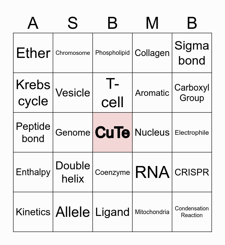 This bingo card has a free space and 24 words: Double helix, Allele, T-cell, Kinetics, Sigma bond, Ether, Krebs cycle, Chromosome, Nucleus, Coenzyme, Aromatic, Peptide bond, RNA, CRISPR, Vesicle, Mitochondria, Electrophile, Phospholipid, Carboxyl Group, Genome, Condensation Reaction, Enthalpy, Collagen and Ligand.