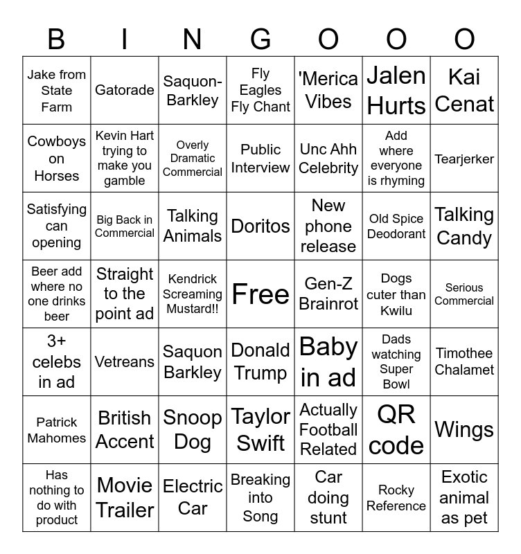 This bingo card has a free space and 48 words: Actually Football Related, Add where everyone is rhyming, Breaking into Song, Straight to the point ad, Talking Animals, Serious Commercial, Gatorade, Movie Trailer, Jalen Hurts, Donald Trump, Kai Cenat, Fly Eagles Fly Chant, Old Spice Deodorant, New phone release, Patrick Mahomes, Dogs cuter than Kwilu, Cowboys on Horses, Tearjerker, QR code, 'Merica Vibes, Unc Ahh Celebrity, Kendrick Screaming Mustard!!, Jake from State Farm, Kevin Hart trying to make you gamble, Wings, Overly Dramatic Commercial, Talking Candy, Has nothing to do with product, Doritos, Big Back in Commercial, Rocky Reference, Gen-Z Brainrot, Timothee Chalamet, British Accent, Beer add where no one drinks beer, Baby in ad, Dads watching Super Bowl, Satisfying can opening, Saquon Barkley, Snoop Dog, 3+ celebs in ad, Exotic animal as pet, Saquon-Barkley, Electric Car, Public Interview, Taylor Swift, Vetreans and Car doing stunt.