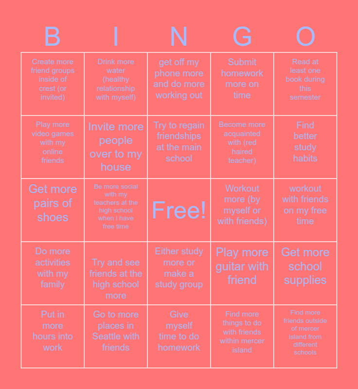 This bingo card has a free space and 24 words: Try and see friends at the high school more, Go to more places in Seattle with friends, Try to regain friendships at the main school, Put in more hours into work, Read at least one book during this semester, Create more friend groups inside of crest (or invited), Play more video games with my online friends, Drink more water (healthy relationship with myself), Workout more (by myself or with friends), Either study more or make a study group, Become more acquainted with (red haired teacher), Get more pairs of shoes, Play more guitar with friend, Get more school supplies, Invite more people over to my house, Find more things to do with friends within mercer island, workout with friends on my free time, get off my phone more and do more working out, Find better study habits, Be more social with my teachers at the high school when i have free time, Find more friends outside of mercer island from different schools, Do more activities with my family, Submit homework more on time and Give myself time to do homework.
