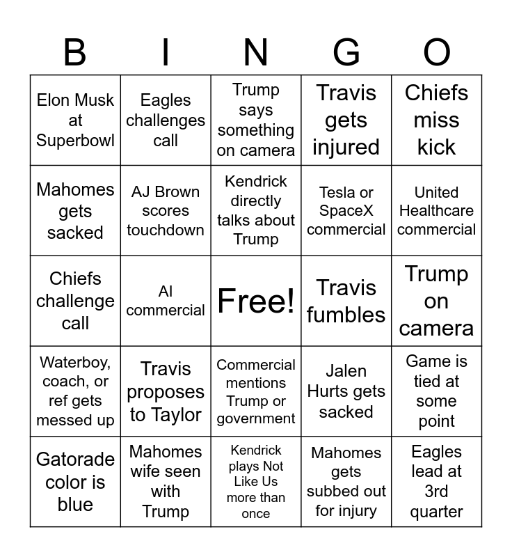 This bingo card has a free space and 24 words: Travis proposes to Taylor, Mahomes wife seen with Trump, Kendrick directly talks about Trump, Gatorade color is blue, Chiefs miss kick, Elon Musk at Superbowl, Mahomes gets sacked, Eagles challenges call, Travis fumbles, Commercial mentions Trump or government, Tesla or SpaceX commercial, Chiefs challenge call, Jalen Hurts gets sacked, Game is tied at some point, AJ Brown scores touchdown, Mahomes gets subbed out for injury, Trump on camera, Trump says something on camera, United Healthcare commercial, AI commercial, Eagles lead at 3rd quarter, Waterboy, coach, or ref gets messed up, Travis gets injured and Kendrick plays Not Like Us more than once.