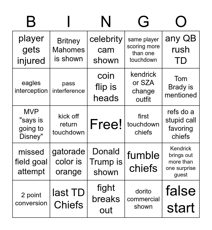This bingo card has a free space and 24 words: gatorade color is orange, last TD Chiefs, coin flip is heads, 2 point conversion, any QB rush TD, player gets injured, eagles interception, Britney Mahomes is shown, first touchdown chiefs, Donald Trump is shown, kendrick or SZA change outfit, MVP "says is going to Disney", fumble chiefs, Kendrick brings out more than one surprise guest, pass interference, dorito commercial shown, refs do a stupid call favoring chiefs, celebrity cam shown, Tom Brady is mentioned, kick off return touchdown, false start, missed field goal attempt, same player scoring more than one touchdown and fight breaks out.
