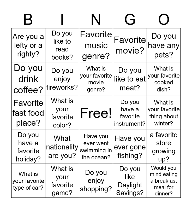 This bingo card has a free space and 24 words: What nationality are you?, What is your favorite game?, What is your favorite movie genre?, What is your favorite type of car?, Do you have any pets?, Are you a lefty or a righty?, Do you drink coffee?, Do you like to read books?, Do you have a favorite instrument?, Have you ever went swimming in the ocean?, Do you like to eat meat?, Favorite fast food place?, Have you ever gone fishing?, a favorite store growing up?, Do you enjoy fireworks?, Do you like Daylight Savings?, What is your favorite thing about winter?, Favorite music genre?, What is your favorite cooked dish?, What is your favorite color?, Would you mind eating a breakfast meal for dinner?, Do you have a favorite holiday?, Favorite movie? and Do you enjoy shopping?.