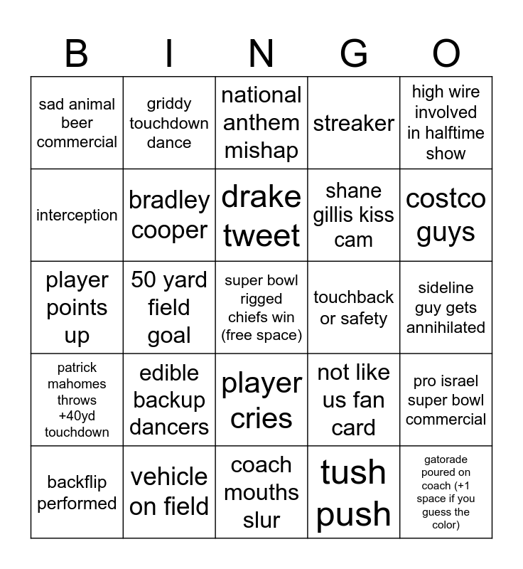 This bingo card has a free space and 24 words: backflip performed, edible backup dancers, drake tweet, tush push, high wire involved in halftime show, sad animal beer commercial, griddy touchdown dance, national anthem mishap, touchback or safety, sideline guy gets annihilated, player points up, bradley cooper, not like us fan card, pro israel super bowl commercial, interception, vehicle on field, coach mouths slur, streaker, costco guys, patrick mahomes throws +40yd touchdown, 50 yard field goal, player cries, shane gillis kiss cam and gatorade poured on coach (+1 space if you guess the color).