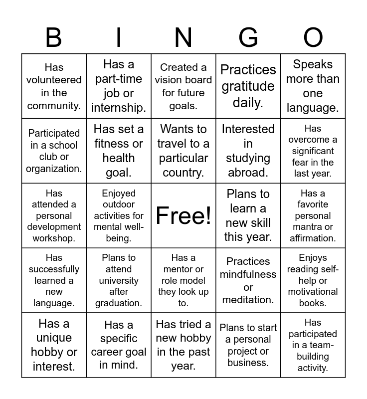 This bingo card has a free space and 24 words: Plans to attend university after graduation., Has a specific career goal in mind., Wants to travel to a particular country., Has a unique hobby or interest., Speaks more than one language., Has volunteered in the community., Participated in a school club or organization., Has a part-time job or internship., Plans to learn a new skill this year., Has a mentor or role model they look up to., Interested in studying abroad., Has attended a personal development workshop., Practices mindfulness or meditation., Enjoys reading self-help or motivational books., Has set a fitness or health goal., Plans to start a personal project or business., Has a favorite personal mantra or affirmation., Created a vision board for future goals., Has overcome a significant fear in the last year., Enjoyed outdoor activities for mental well-being., Has participated in a team-building activity., Has successfully learned a new language., Practices gratitude daily. and Has tried a new hobby in the past year..