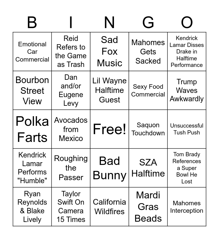 This bingo card has a free space and 39 words: A Manning Brother, Right Wing Commerical (excluding Jesus), Movie Trailer Premier, Dan and/or Eugene Levy, Ryan Reynolds & Blake Lively, Bad Bunny, Lil Wayne Halftime Guest, Dead Celebrity, Kendrick Lamar Disses Drake in Halftime Performance, Kendrick Lamar Performs "Humble", Avocados from Mexico, Mahomes Gets Sacked, Mahomes Interception, Unsuccessful Tush Push, Saquon Touchdown, Roughing the Passer, Aggressive Car Commerical, Emotional Car Commercial, Lip Syncing, SZA Halftime, Bourbon Street View, California Wildfires, Sexy Food Commercial, Trump Waves Awkwardly, Previous Co-Stars Together, Trapped in a Small Town, Shirtless Fat Guy or Girl, 90s Heartthrob, Commercial for a Reboot Series, Reid Refers to the Game as Trash, Pro Wrestler, Jason Kelce, Sad Fox Music, Taylor Swift On Camera 15 Times, Mardi Gras Beads, Jazz Music, Tom Brady References a Super Bowl He Lost, Polka Farts and Touchdown of Over 50 Yards.