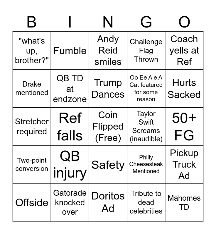 This bingo card has a free space and 49 words: False Start, Mahomes TD, Missed Field Goal, Doritos Ad, QB injury, Extra point kicked, Fumble, Interception, Drake mentioned, Trump shoutout in Halftime performance, QB TD at endzone, Challenge Flag Thrown, Pickup Truck Ad, Philly Cheesesteak Mentioned, Wide Receiver Injured, Audio Issues, Trump Dances, Taylor Swift Screams (inaudible), Giants roasted for trading Barkley, Coach yells at Ref, Ref falls, Tribute to dead celebrities, "what's up, brother?", Oo Ee A e A Cat featured for some reason, Weirdly emotional Ad, Hurts Sacked, Offside, Mahomes Sacked, Safety, Two-point conversion, Footage of Bourbon St., Disney Trailer, Soldier appearance, Gatorade Shower, Gatorade knocked over, Punt, Goodell smiles, Kelce TD, 50+ FG, Three-peat, Taylor Swift sings along to Not Like Us, SZA holds backup dancers hand, Gronk glazes Tom Brady, Backup Dancer falls, Stretcher required, Andy Reid smiles, Belichick mentioned, Sirianni smiles and Spank.