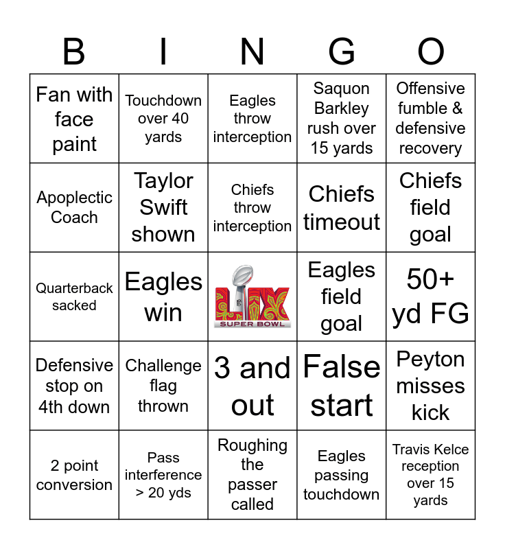 This bingo card has a free space and 34 words: Chiefs passing touchdown, Eagles passing touchdown, Chiefs rushing touchdown, Eagles rushing touchdown, Defensive stop on 4th down, Taylor Swift shown, Offensive fumble & defensive recovery, 2 point conversion, Touchdown over 40 yards, Tush push, Chiefs throw interception, Eagles throw interception, Missed field goal, Game tied up after 0-0, Eagles field goal, Chiefs field goal, Pass interference > 20 yds, Quarterback sacked, Challenge flag thrown, False start, 3 and out, Any team scores 20+ points, Fan with face paint, 50+ yd FG, Roughing the passer called, Travis Kelce reception over 15 yards, Saquon Barkley rush over 15 yards, Eagles timeout, Chiefs timeout, Apoplectic Coach, Chiefs win, Eagles win, Peyton misses kick and Eli misses kick.