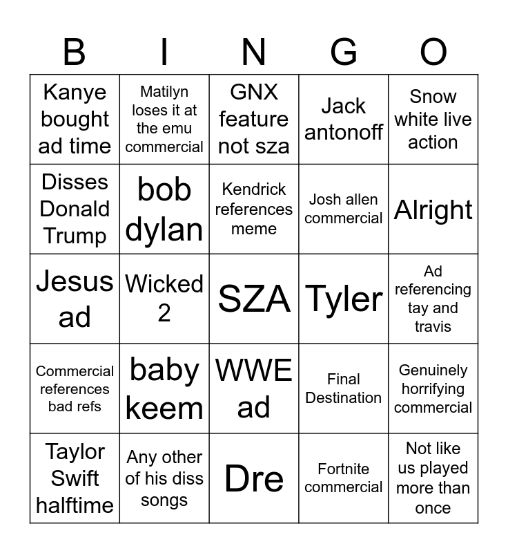 This bingo card has a free space and 24 words: baby keem, Any other of his diss songs, Kendrick references meme, Taylor Swift halftime, Snow white live action, Kanye bought ad time, Disses Donald Trump, Matilyn loses it at the emu commercial, Tyler, WWE ad, Josh allen commercial, Jesus ad, Final Destination, Genuinely horrifying commercial, bob dylan, Fortnite commercial, Ad referencing tay and travis, GNX feature not sza, Alright, Wicked 2, Not like us played more than once, Commercial references bad refs, Jack antonoff and Dre.