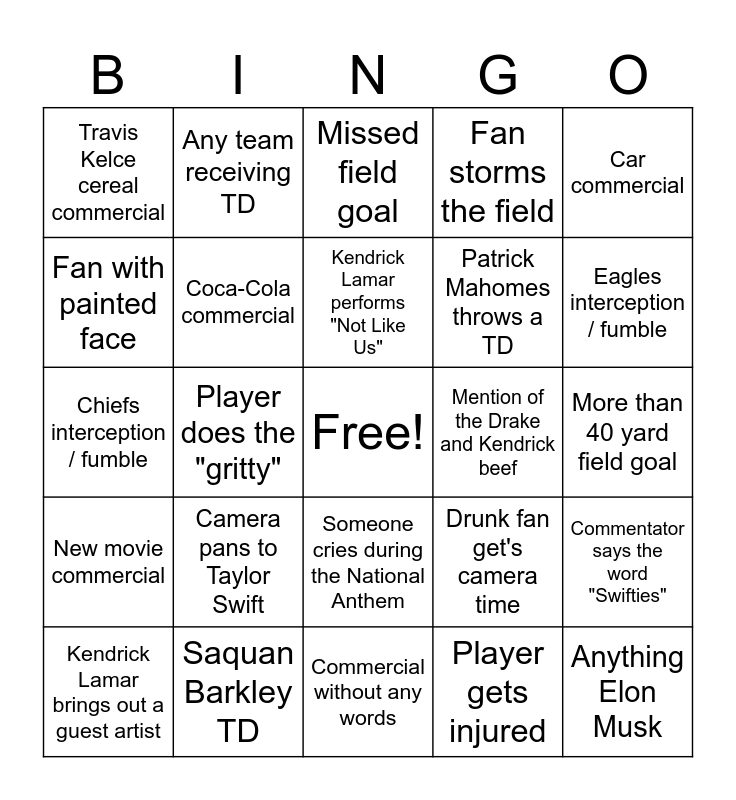This bingo card has a free space and 24 words: Camera pans to Taylor Swift, Saquan Barkley TD, Kendrick Lamar performs "Not Like Us", Kendrick Lamar brings out a guest artist, Car commercial, Travis Kelce cereal commercial, Fan with painted face, Any team receiving TD, Mention of the Drake and Kendrick beef, Someone cries during the National Anthem, Patrick Mahomes throws a TD, Chiefs interception / fumble, Drunk fan get's camera time, Commentator says the word "Swifties", Coca-Cola commercial, Player gets injured, More than 40 yard field goal, Missed field goal, Eagles interception / fumble, Player does the "gritty", Anything Elon Musk, New movie commercial, Fan storms the field and Commercial without any words.
