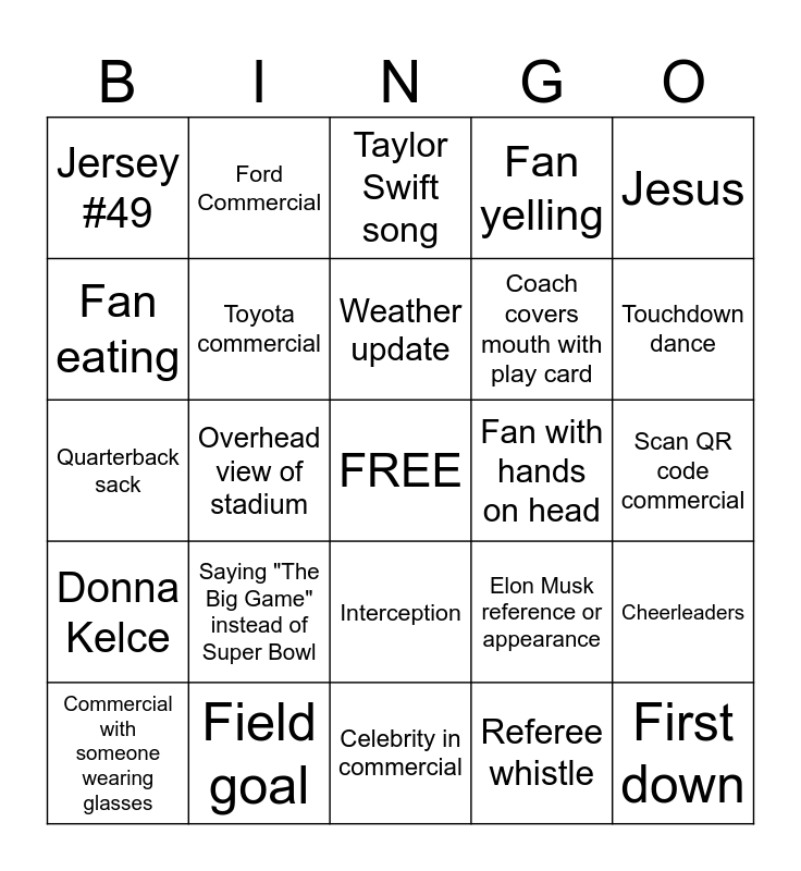 This bingo card has a free space and 24 words: Saying "The Big Game" instead of Super Bowl, Field goal, Weather update, Commercial with someone wearing glasses, Jesus, Jersey #49, Fan eating, Ford Commercial, Fan with hands on head, Interception, Coach covers mouth with play card, Quarterback sack, Elon Musk reference or appearance, Cheerleaders, Toyota commercial, Referee whistle, Scan QR code commercial, Taylor Swift song, Touchdown dance, Overhead view of stadium, First down, Donna Kelce, Fan yelling and Celebrity in commercial.