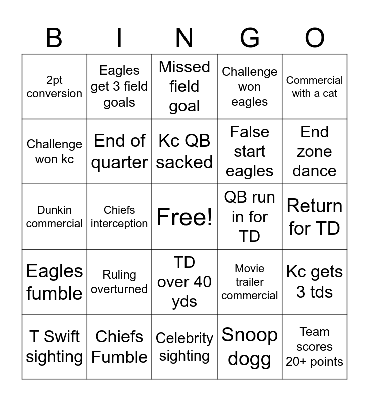 This bingo card has a free space and 29 words: T Swift sighting, Doritos commercial, Chiefs interception, Eagles interception, 2pt conversion, Missed field goal, End of quarter, Ruling overturned, QB run in for TD, Chiefs Fumble, Return for TD, Team scores 20+ points, Celebrity sighting, Snoop dogg, End zone dance, False start, TD over 40 yds, Eagles fumble, Commercial with a cat, Dunkin commercial, Movie trailer commercial, False start kc, False start eagles, Challenge won kc, Challenge won eagles, Eagles get 3 field goals, Kc gets 3 tds, Kc QB sacked and Eagles QB sacked.