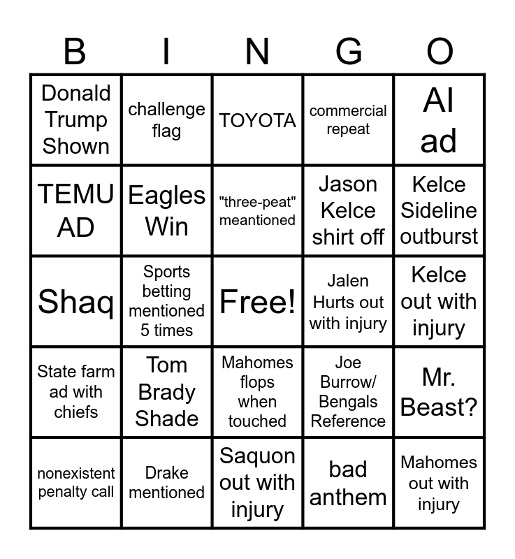 This bingo card has a free space and 39 words: Taylor Swift Shown 5 Times, Kelce Proposes, Chiefs win, Eagles Win, nonexistent penalty call, Mahomes flops when touched, "three-peat" meantioned, taylor swift song played, AI ad, State farm ad with chiefs, Sports betting mentioned 5 times, commercial repeat, Mahomes out with injury, Kelce out with injury, Jalen Hurts out with injury, Tom Brady Shade, FOX technical error, Donald Trump Shown, Kendrick Lamar "Not Like us", Joe Burrow/ Bengals Reference, TEMU AD, Saquon out with injury, Jason Kelce shirt off, Kelce Sideline outburst, FOX mentions Taylor, Military / Gov Propaganda, Apple Ad, Google Ad, "Superbowl rematch" meantioned, challenge flag, missed field goal/XP, player removed from game, TOYOTA, Drake mentioned, bad anthem, streaker, Mr. Beast?, Shaq and Hyundai ad.