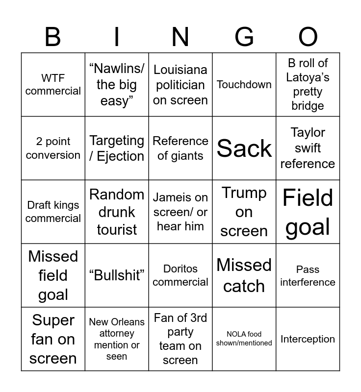 This bingo card has 37 words: Bad commercial, Taylor swift on screen, Travis proposes, Targeting / Ejection, Pass interference, “Bullshit”, Reference of giants, Reference of saints, B roll of Latoya’s pretty bridge, Bourbon st on screen, Random drunk tourist, Touchdown, Jameis on screen/ or hear him, Field goal, 2 point conversion, Missed field goal, Crying on screen, Louisiana politician on screen, Doritos commercial, Trump on screen, WTF commercial, Taylor swift reference, Super fan on screen, Fan of 3rd party team on screen, Dome pan shot, NOLA food shown/mentioned, “Nawlins/ the big easy”, Roughing penalty, Quarterback touchdown run, Flag, Local commercial, New Orleans attorney mention or seen, Draft kings commercial, Interception, Missed catch, Sack and 40 yard run.