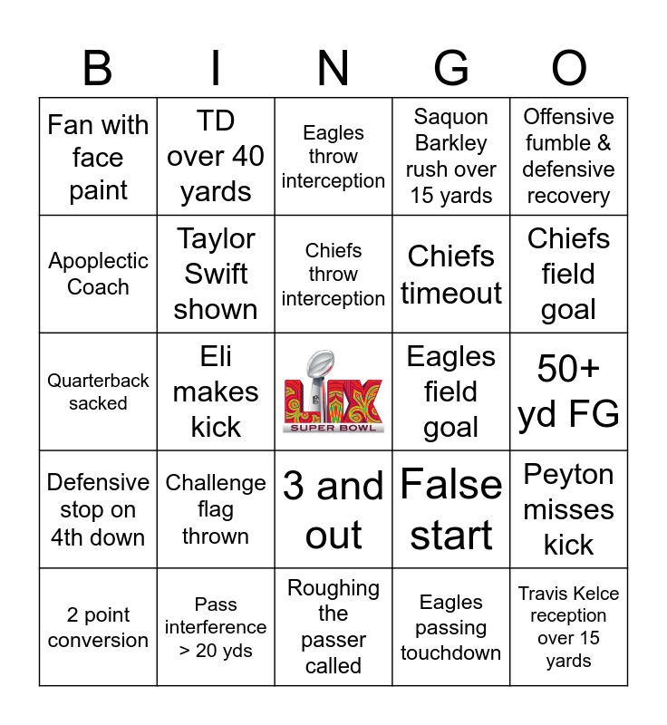 This bingo card has a free space and 34 words: Chiefs passing touchdown, Eagles passing touchdown, Chiefs rushing touchdown, Eagles rushing touchdown, Defensive stop on 4th down, Taylor Swift shown, Offensive fumble & defensive recovery, 2 point conversion, TD over 40 yards, Tush push, Chiefs throw interception, Eagles throw interception, Missed field goal, Game tied up after 0-0, Eagles field goal, Chiefs field goal, Pass interference > 20 yds, Quarterback sacked, Challenge flag thrown, False start, 3 and out, Any team scores 20+ points, Fan with face paint, 50+ yd FG, Roughing the passer called, Travis Kelce reception over 15 yards, Saquon Barkley rush over 15 yards, Eagles timeout, Chiefs timeout, Apoplectic Coach, Peyton makes kick, Eli makes kick, Peyton misses kick and Eli misses kick.